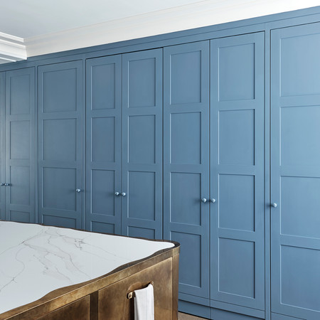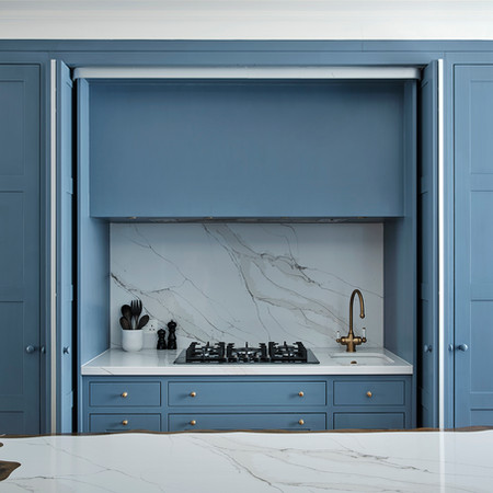 These discreet kitchen cabinets feature a charming blue painted Shaker design. What sets them apart is the innovative use of pocket doors, allowing them to be completely concealed when not in use.
